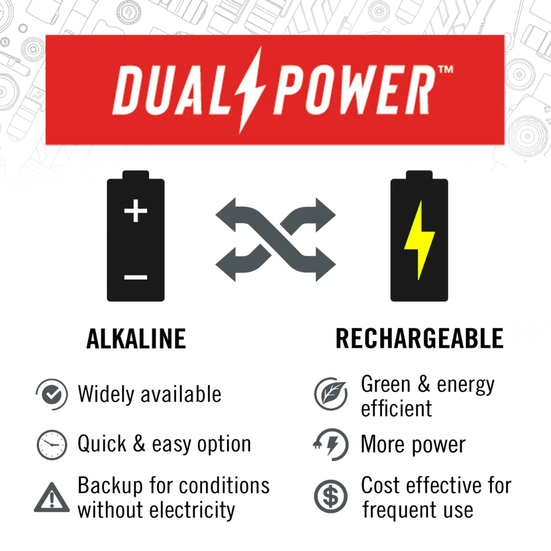 Dual Power lets you choose: run on included alkaline batteries or upgrade with a COAST ZITHION-X™ rechargeable for extended, cost-saving performance.