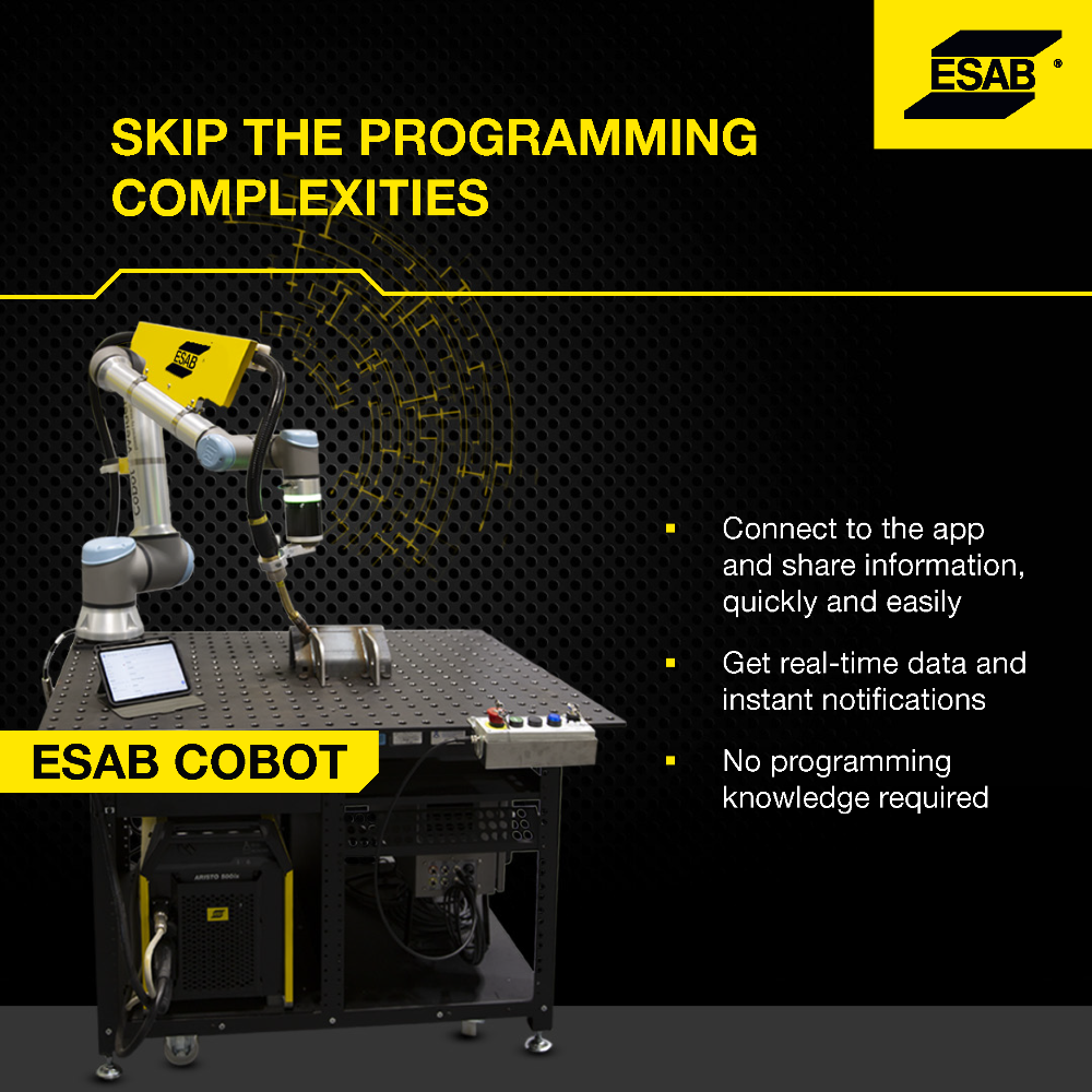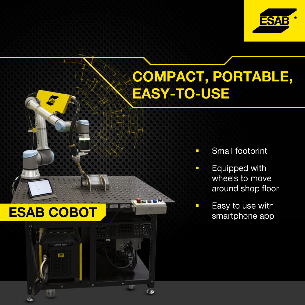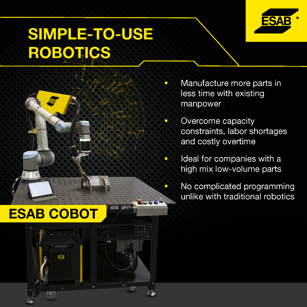 ESAB Cobots (Collaborative Robots) solve today’s toughest challenges in the most demanding environments, including industries with a high mix of low-volume parts. It allows for increased output and productivity –without more manpower –all in a small footprint.