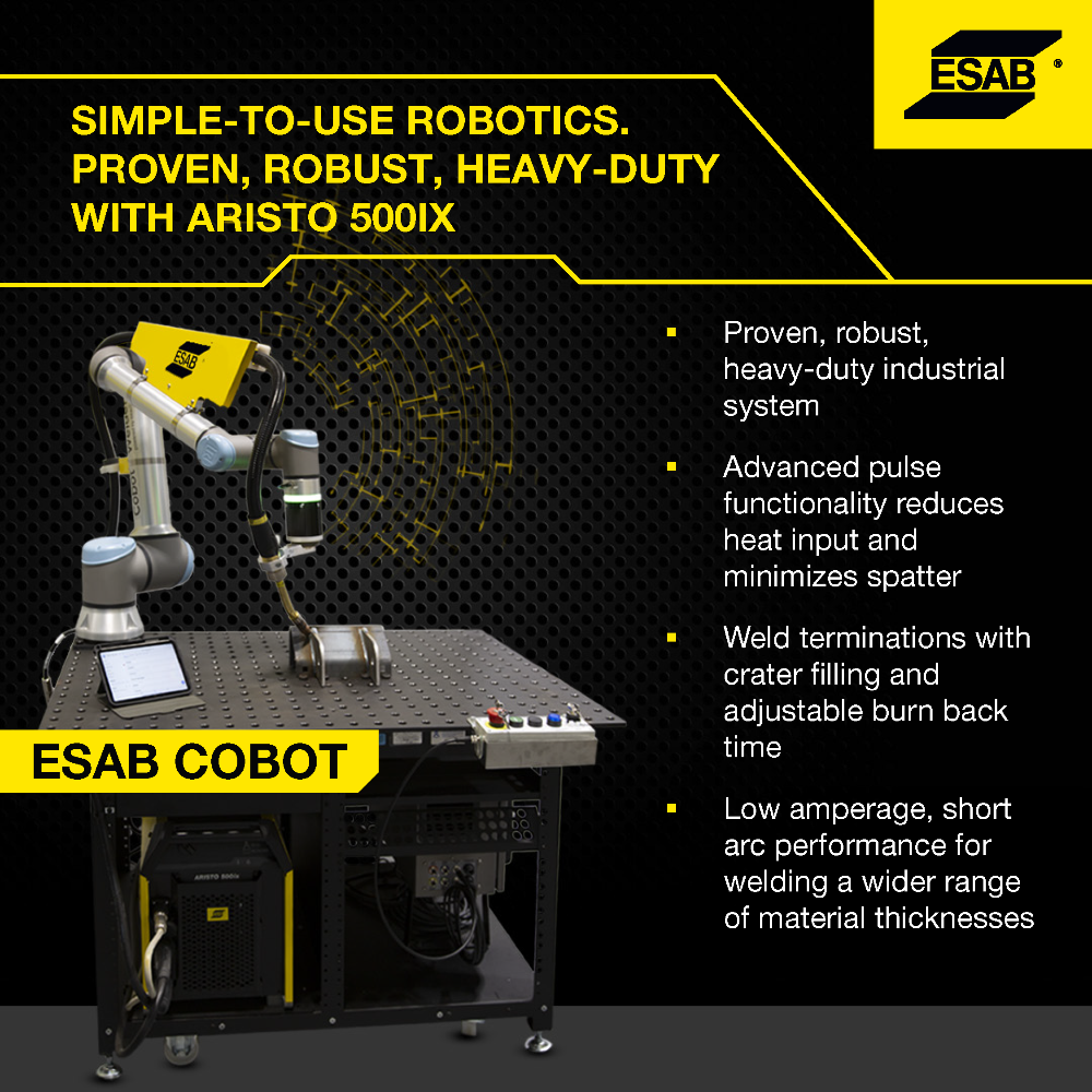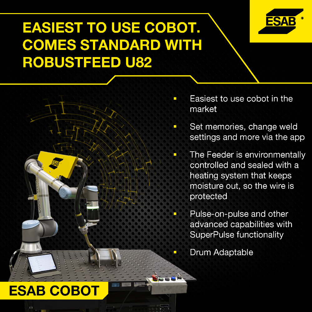 Combined with the easy to service and premium quality Universal Robotics arm plus the Aristo 500ix, a heavy industrial pulse power source, and the RobustFeed U82, ESAB Cobot is the ideal solution for superior feed-ability and arc performance.